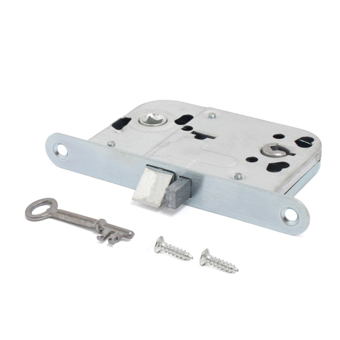 Защёлка врезная с фиксатором для "финских дверей" с четвертью (притвором). Материал — сталь. Гарантийный срок эксплуатации — 3 года. Ответная планка приобретаются отдельно. Запирается при помощи стандартного ключа, входящего в комплект или сантехнической завертки, которая приобретается отдельно.