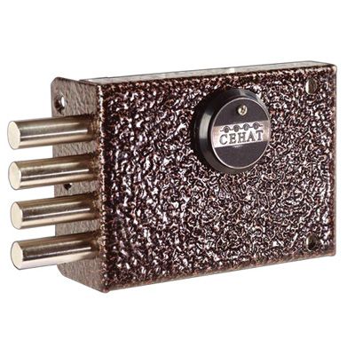 Замок накладной цилиндровый. В нем используется цилиндр со штифтами и плоский ключ. Это наиболее популярные и недорогие модели. Обеспечивают высокий уровень секретности и в случае поломки легко ремонтируются. Чаще всего устанавливаются в квартирах.