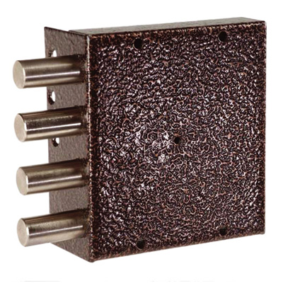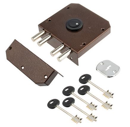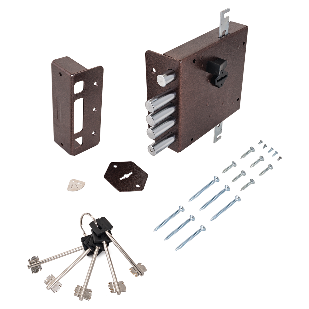 Надежно запирают дверь. Мощные ригели надежно удерживают полотно в обвязке, препятствуя отпиранию методом отжатия или взлома механизма.